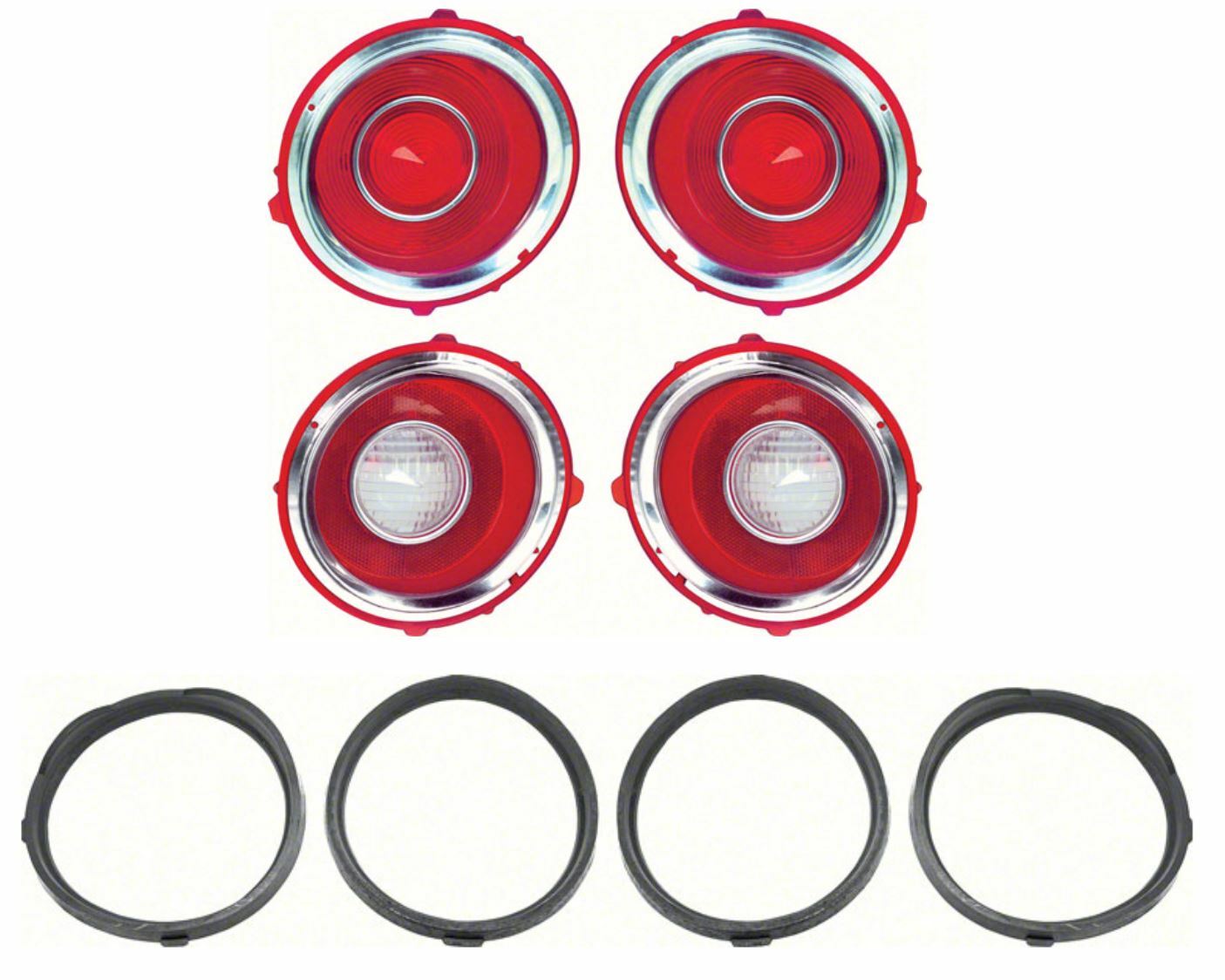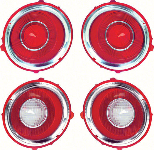 Save when ordering a complete set of tail lamp and back-up lamp lenses for your 1970-71 Camaro RS. This kit features lenses with chrome trim rings and includes 2 tail lamp lenses, 2 back-up lamp lenses and gaskets with the early 1971 1st design circular optics.