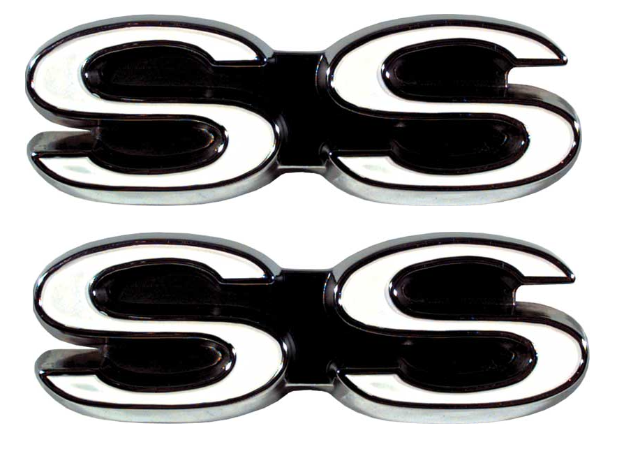 Quality reproduction of the original SS front fender emblem designed for use on 1968 Camaro SS models. Manufactured in zinc die-cast metal replicating the original in fitment and appearance. Each emblem features white lettering with a matt black background. Includes mounting hardware.