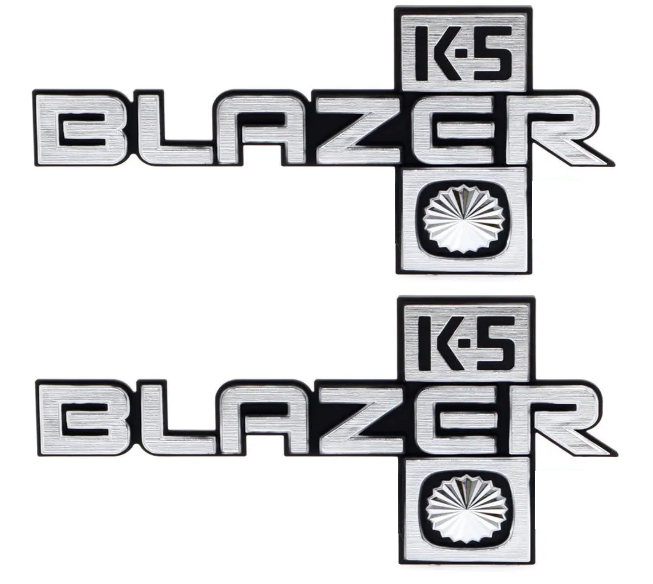 OER reproduction of the "K5 Blazer" emblems that mount to the front fenders of a 1981-1988 Chevy K5 Blazer. Each emblem is injection molded plastic, chrome plated, and painted with correct colored accents as original.