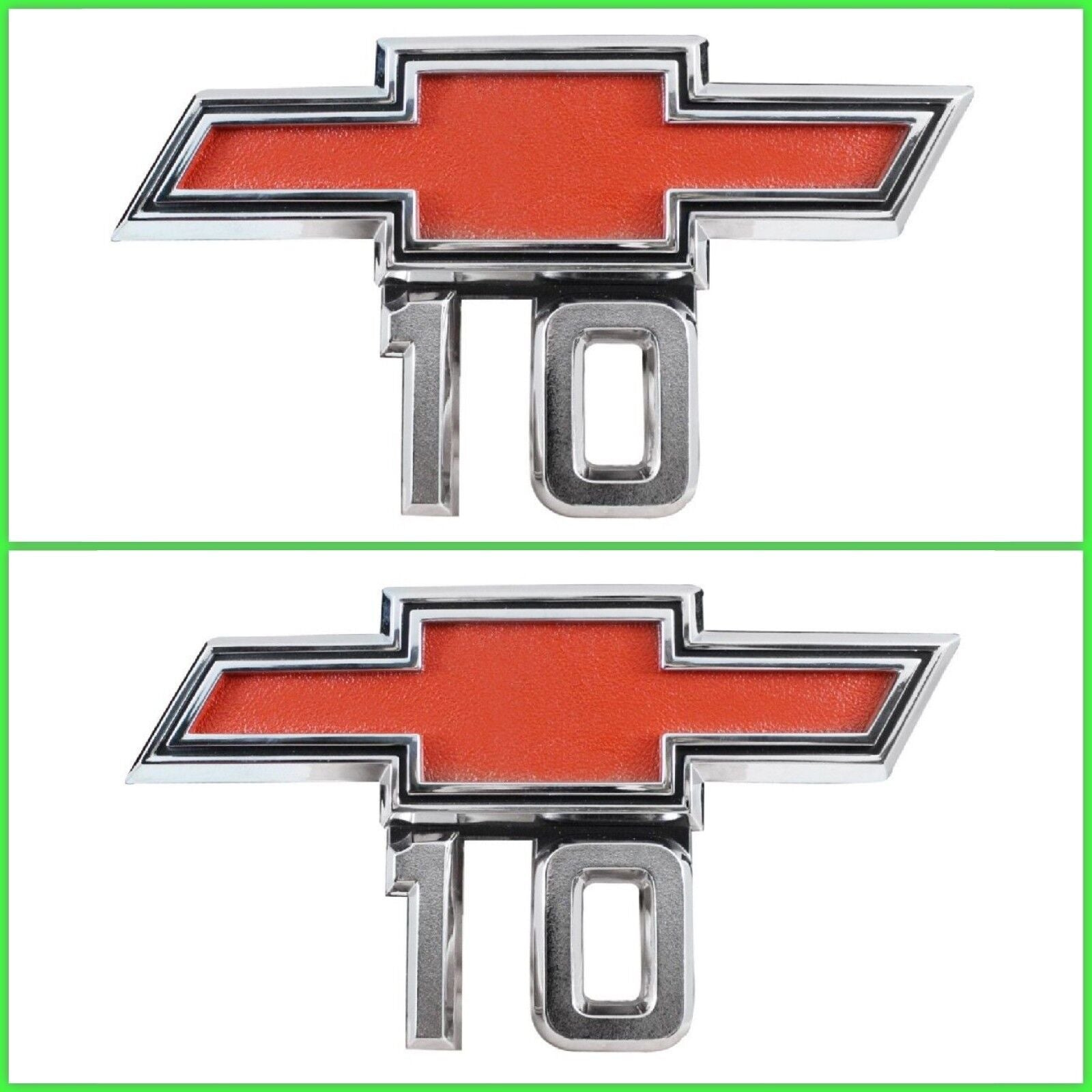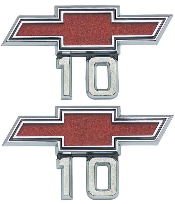 Reproduction of the original Bow Tie 10 front fender emblem designed for use with 1967-68 Chevrolet Truck and various van and step van models. Each emblem is manufactured in die-cast zinc to factory specifications for an authentic appearance. Features the correct red Bow Tie with "10". Sold in pairs.