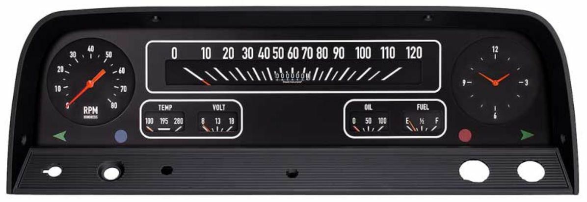 The 1964-66 Chevy truck direct-fit clusters feature a speedometer, tachometer, fuel, oil, temperature, volt gauges, and a 12V quartz clock decked out in one of four color schemes: black, tan, white, or gray. Choose black for a near-stock appearance or select one of the other color options to suit your project! The all-electric cluster with easy snap-in wiring harness arrives ready to install directly into the stock dash of 1964-66 trucks; no cutting or alterations necessary. Perhaps the best feature: the cluster includes Classic Instruments' Zeus Speedometer Technology built right in, which means no external control boxes are needed. It is designed to re-use the factory dash bezel to maintain the original styling of the vehicle, but has been upgraded with bright LED lighting for even illumination and clear nighttime readability. Includes a scratch-resistant acrylic lens and necessary sending units. No need to worry about fuel sending unit compatibility either; the cluster features a fuel sending unit selector switch to set it for compatibility with the existing/factory fuel sending unit, no new sending unit necessary.