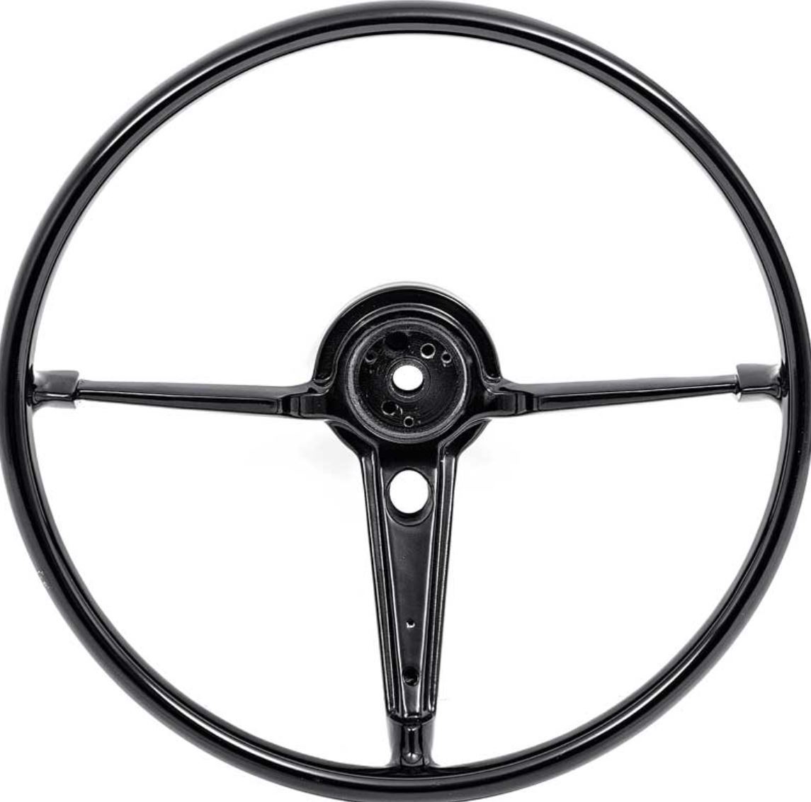 Reproduction-style 16" steering wheel for 1955-56 Chevrolet passenger cars. These high quality steering wheels are manufactured in durable plastic over a steel core and come finished in gloss black. Steering wheels accept original or reproduction horn parts.