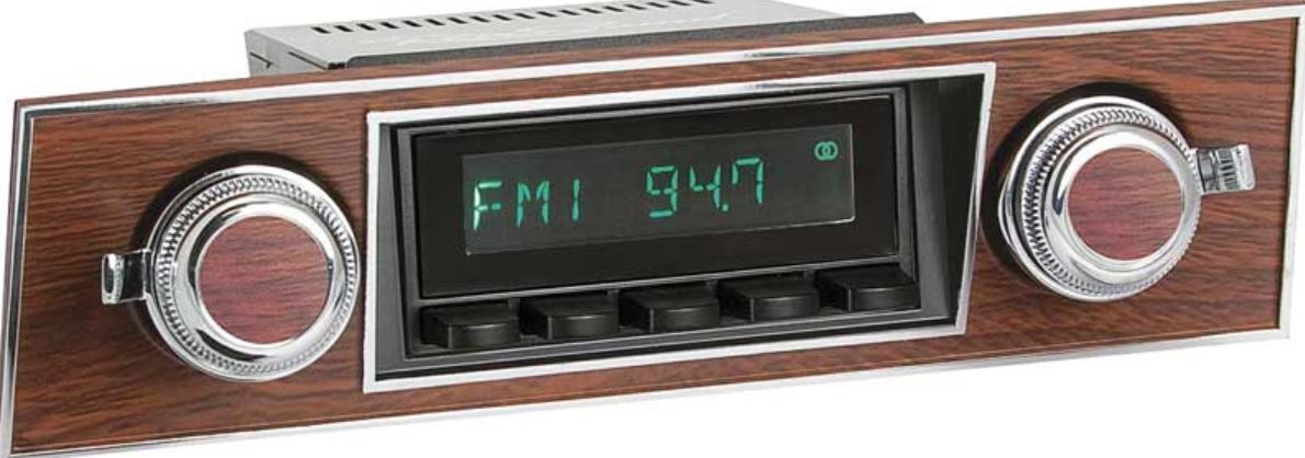 It also features a new dual color (green or white) display, front and rear RCA pre-outs and a built-in 25 watts x 4 channel RMS amplifier. Features: Built-in Bluetooth® technology for h ands-free phone operation Wireless audio streaming from iPhone® or Android®-basedphone Authentic push-button styling Enhanced LCD display with selectable white or green illumination AM/FM tuner w/ 30 presets & RDS LCD display shows track names Selectable USA/EU tuner frequencies 2 rear auxiliary inputs 3 EQ presets plus bass, treble, fader and balance adjustments Two sets of RCA low level outputs 25 watt x 4 channel RMS amplifier Plays MP3 & WMA files via USB input