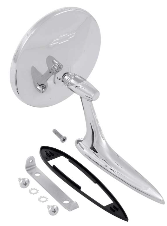 Excellent reproduction of the original outer door mirrors for various 1963-1965 GM models. Each mirror is manufactured in quality zinc die-cast metal and chrome plated replicating the original in quality, fitment and appearance. These mirrors feature a ribbed neck and with a Bow Tie insignia cast into the rear of the mirror head. Comes complete with a mirror to door bracket, mirror base gasket, and mounting screws.