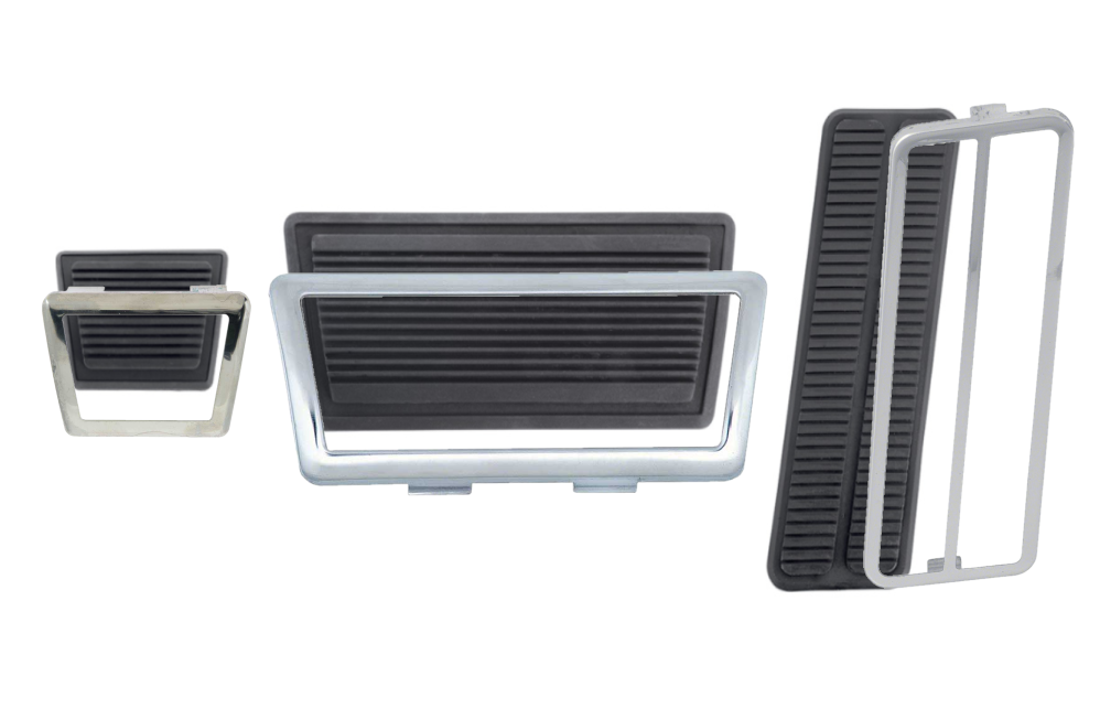 Reproduction of the original pedal pads and trim plates designed for 1969 Firebird models. This pedal pad set is designed to replace the worn out original pads for 1969 Firebird models with automatic transmission. Replacing the pedal pads will renew the appearance of your interior while maintaining originality. Includes the brake pad, accelerator pad, park brake pad in a 3-piece set with the 3 piece pedal pad trim set.