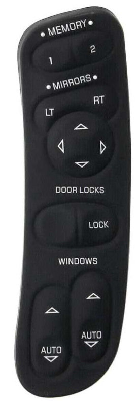 Service replacement style power window and door lock switch assembly for the driver side on 1997-2004 C5 Corvette models. Produced in injection molded plastic, each assembly includes the memory function, mirror controls, door lock switch, and power window switch with an integral bezel for a convenient plug-n-play replacement. May differ slightly cosmetically from the original equipment part, but will fit and function properly.
