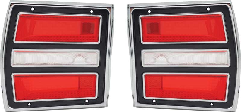 Reproduction tail lamp assemblies for 1968 Dodge Dart models. Each assembly is manufactured as original with the correct housing, chrome bezel and proper lens color. Sold in a pair.