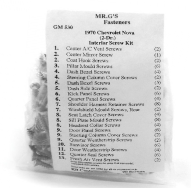 90 Piece Interior Screw Set For 1970 Chevy Nova 2 Door Models