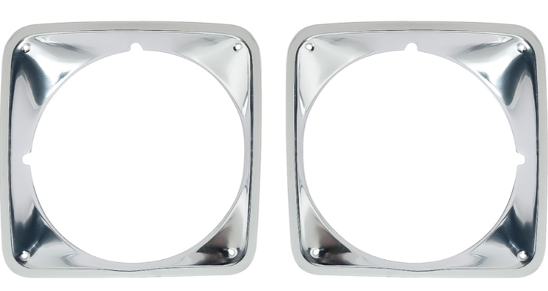 Reproduction headlamp bezel set for 1969-1972 Chevrolet pickup, Blazer and Suburban models. Manufactured in quality stamped aluminum, each bezel set replicates the original in fit and design. Features correct contours and finish for an authentic appearance.
