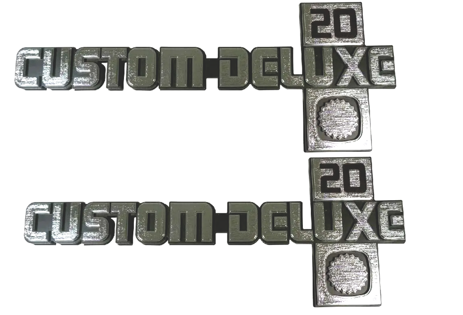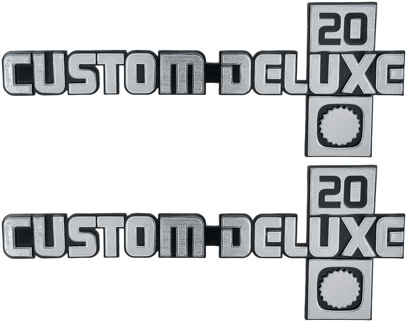 OER reproduction of the "CUSTOM DELUXE 20" emblem set that mounts to the front fender of a 1981-1987 Chevy C20. Each emblem is injection molded plastic, chrome plated, and painted with correct colored accents as original. Comes with the mounting nuts for an easy installation.