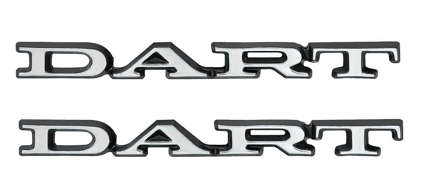 Authentic reproduction of the original "Dart" front fender emblems designed for use on 1971-1974 Dodge Dart vehicles. Each emblem is designed and manufactured in die-cast zinc metal to exact specifications including correct brushed chrome face with black border. Also includes correct mounting pins for installation. Emblem includes all original markings on the back of the each emblem offering complete originality and authenticity.