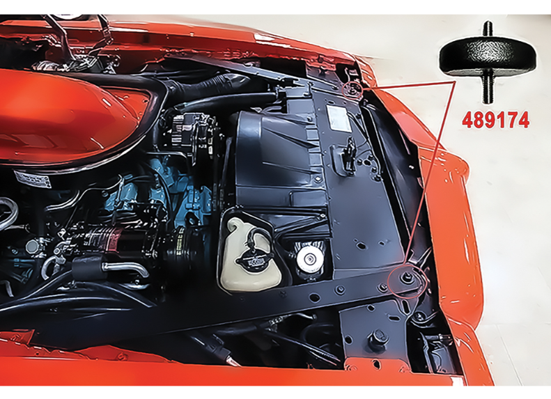 Replacement steel front fender brace to radiator support stabilizer bushing for 1973 Pontiac Firebird models. The 1973 Firebird was equipped with a heavier front bumper assembly to satisfy federal impact ratings, this billet steel bushing is made to prevent sagging and panel misalignment due to the heavier bumper components.