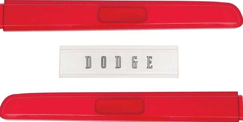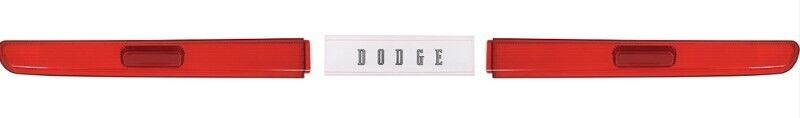 Reproduction of the original tail lamp lenses and back up lens set for 1970 Dodge Challenger models. Each lens set is manufactured in quality injection molded red and clear acrylic material that offers an authentic appearance and fit. Center lens features the "DODGE" lettering pre-installed on the lens, as original. Set includes RH and LH red tail light lenses, and center clear lens.