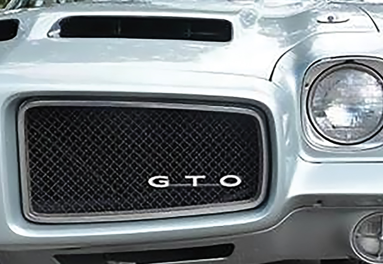 Reproduction GTO nameplate grill emblem. This emblem fits on left side front grill. Zinc die-cast emblem features chrome plated letters, backfilled in white, with black bar background accenting, just like the original. Replaces GM # 482859.