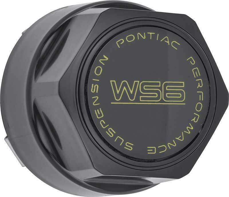 Reproduction wheel center hub cap for 1987-92 Pontiac Firebird models with the WS6 performance package. This black plastic cap features a black center with the gold "WS6 Performance Suspension" logo. Can be used on 1982-92 models. Sold as a set of 4.