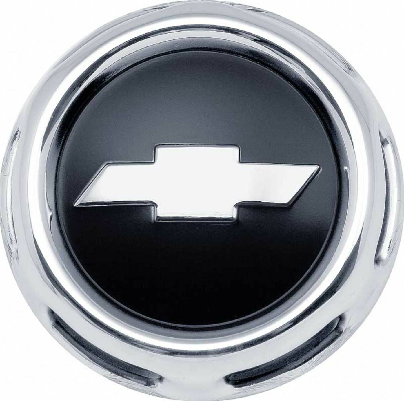 Reproduction of the horn cap used on 1957-1959 Chevrolet trucks. This beautiful horn cap features a black center with a chrome Bow Tie and chrome edging.